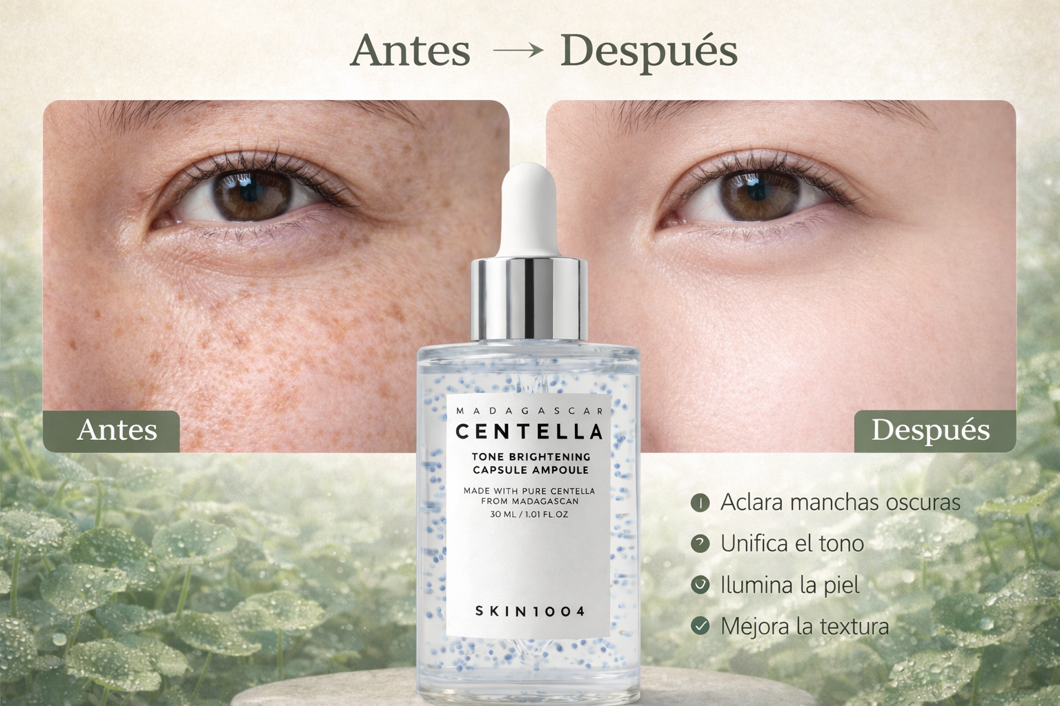Es ideal para personas con tono desigual, manchas oscuras o piel apagada que desean una apariencia más luminosa y uniforme. También ayuda a calmar e hidratar ligeramente mientras fortalece la barrera cutánea. Sí es apto para piel débil o sensible, ya que contiene centella asiática y activos calmantes que suelen ser bien tolerados.