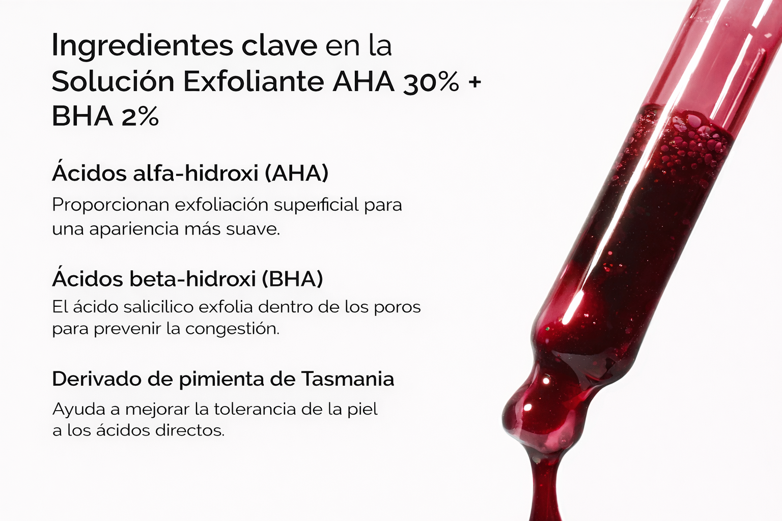 The Ordinary AHA 30% + BHA 2% Peeling Solution es un peeling químico exfoliante que ayuda a mejorar la textura, luminosidad y uniformidad de la piel, limpiando poros y reduciendo manchas y líneas finas. Se usa 1–2 veces por semana, máximo 10 minutos, y es ideal para pieles con experiencia en ácidos. Uso de protector solar indispensable. 30ml
